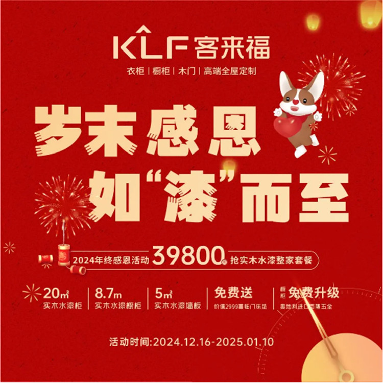 實(shí)木水漆,整家煥新。即日起至2025年1月10日,客來(lái)福家居聯(lián)動(dòng)全國(guó)百城千家門店,共同開啟“2024年終感恩”全民狂歡活動(dòng),為家居品質(zhì)升級(jí),環(huán)保升級(jí),舒適升級(jí)。