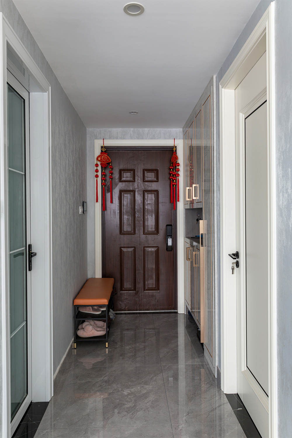 從玄關(guān)柜進(jìn)入家里。玄關(guān)柜采用嵌入式和到頂?shù)姆绞?,?jié)省空間又美觀。