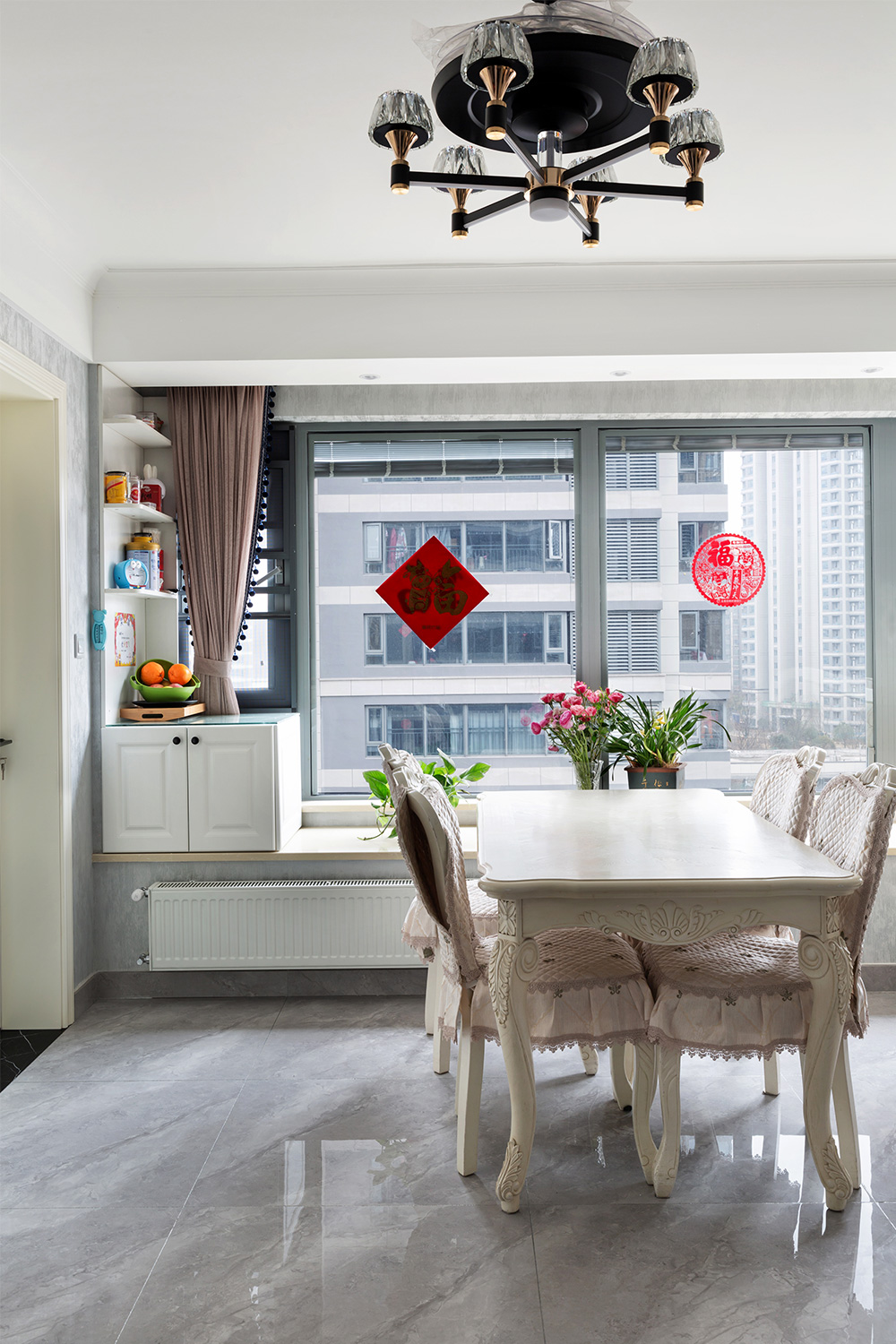 從玄關(guān)進(jìn)來(lái)就是帶有復(fù)古花色氣息的餐桌,為了留出寬敞的過(guò)道,選用輕巧的四人餐桌椅,靠近廚房的位置不會(huì)占用太多的地方,動(dòng)線緊湊方便上菜。
