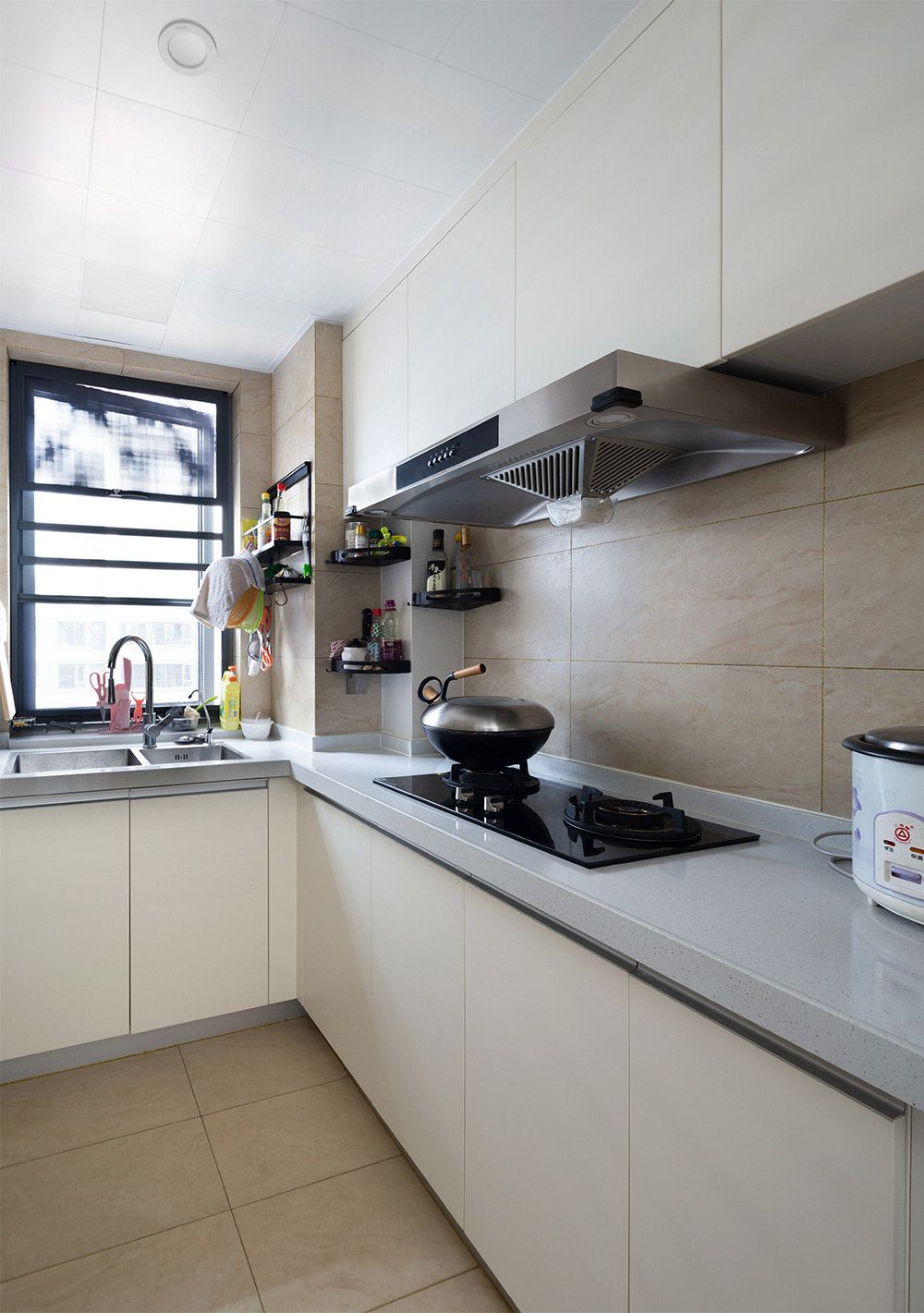 廚房采用L型的櫥柜布局,水槽設(shè)在窗邊,光線明亮,洗、切、炒動(dòng)線十分流暢,做飯也更得心順手。櫥柜采用無(wú)把手兩開(kāi)門(mén)的設(shè)計(jì),櫥臺(tái)平面光潔明亮。做飯時(shí)的煙火氣,讓生活平添幸福之感。