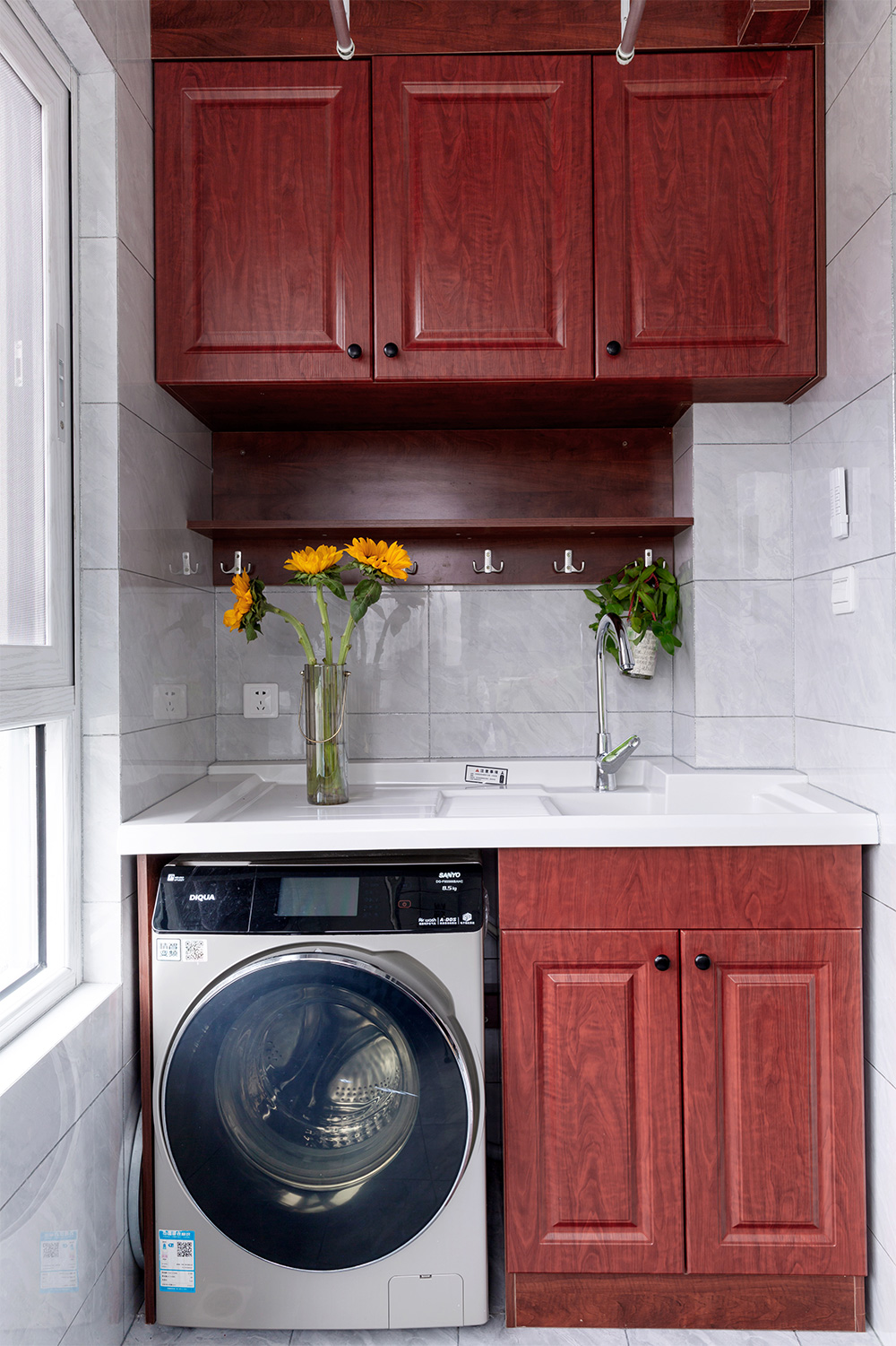 陽(yáng)臺(tái)也是沿襲次臥的風(fēng)格,整體式的洗衣機(jī)柜,下方做了兩開(kāi)門(mén)的儲(chǔ)物柜。中間做了掛柜的設(shè)計(jì),在洗滌衣物時(shí)放置需要使用物品,上方的儲(chǔ)物柜做了分層設(shè)計(jì),最大程度增大的收納空間。