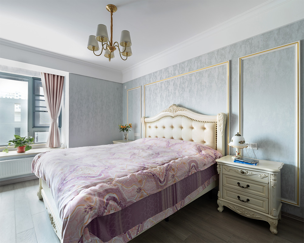 主臥沿襲了玄關(guān)柜的風(fēng)格,歐式風(fēng)格的床頭柜,墻面的金色的鑲邊,沒(méi)有太過(guò)花哨的裝飾,溫馨自然。衣柜旁的大飄窗,光線充足。同色系的裝飾畫(huà),讓房間風(fēng)格不再生硬。
