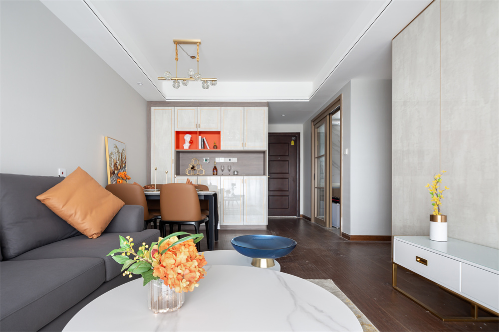 布藝灰色沙發(fā)布料十分柔軟,坐下去沙發(fā)表面也具有一定彈性。橘色的抱枕仿佛將整個(gè)空間點(diǎn)亮了一般,與右側(cè)的橘色座椅顏色相呼應(yīng)。圓形拼接的茶幾在寓意上傳遞出“和諧”,搭配金色的桌腳一下子提升了高級(jí)感。