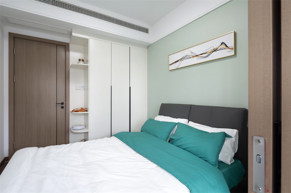 主臥室在沿用輕奢的風(fēng)格同時(shí)做了細(xì)微的調(diào)整,薄荷綠色的背景顯得清新又自然,仿佛如修剪草地后散發(fā)的清香。衣柜延伸出的轉(zhuǎn)角區(qū)域充分利用了衣柜旁的空間,可以隨手放置書本、眼鏡、收納籃。