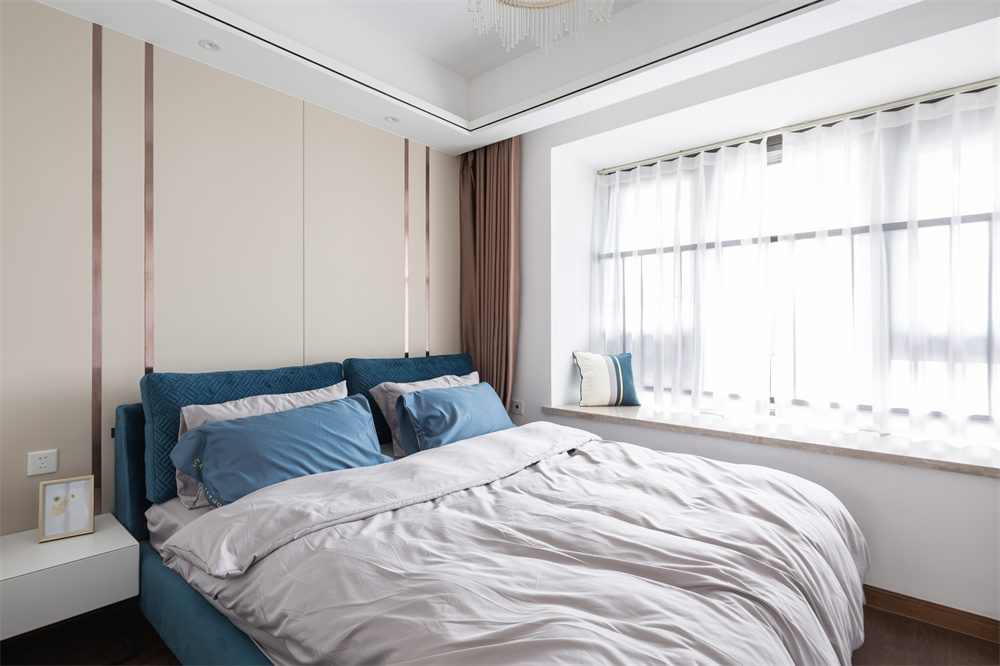 次臥平常是用來(lái)平時(shí)招待客人或者父母來(lái)時(shí)住的房間,枕頭選擇了傳統(tǒng)的藍(lán)加白的設(shè)計(jì),如天空一般清爽自在。半開門式衣柜將兩塊柜門的之間的距離按照合適比例設(shè)計(jì),避免門板出現(xiàn)碰撞的情況。