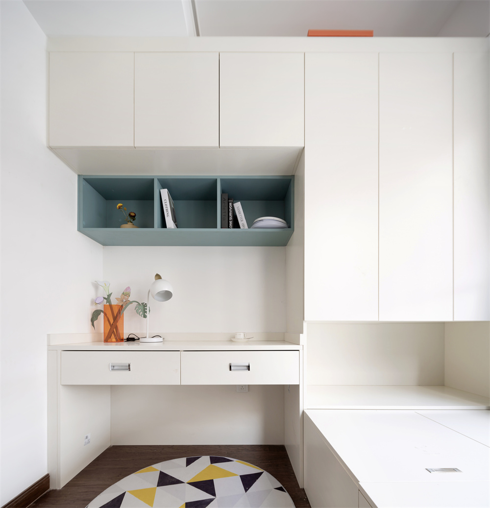 采用了書桌和榻榻米相結(jié)合的形式。抽屜中間留出把手的位置,具有自動(dòng)吸附功能。幾何圖案的地毯增添了房間內(nèi)的俏皮感。