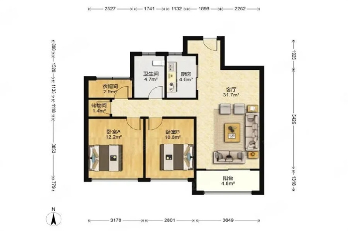 這套兩居室的戶型簡單來說便是凸字型的房屋空間結(jié)構(gòu),戶主想要增加客廳的面積,將陽臺打通,于是客廳處總共面積為35.9㎡,在主臥處的儲物間和衣帽間也將兩者打通,主臥的面積為16.5㎡,滿足了日?;镜纳钚枨?。
