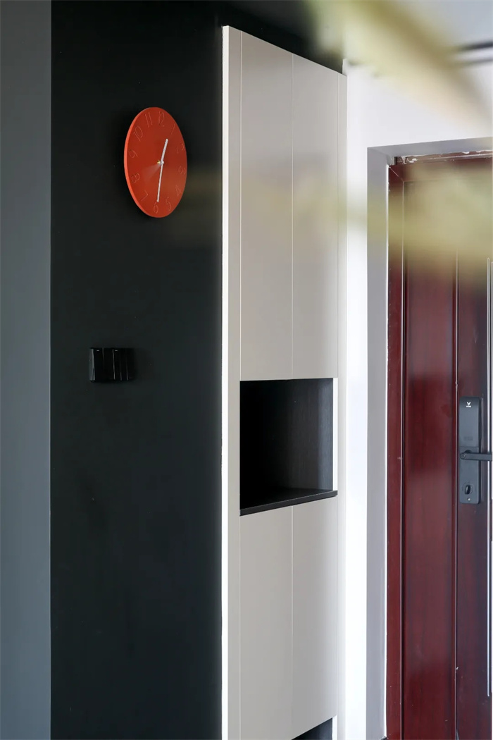 玄關(guān)處的柜體采用兩開門的樣式,中間部分內(nèi)置燈帶鑰匙、快遞、裝飾物便于查找。下方留出空間用于放置日常在家穿的拖鞋。
