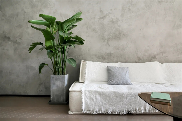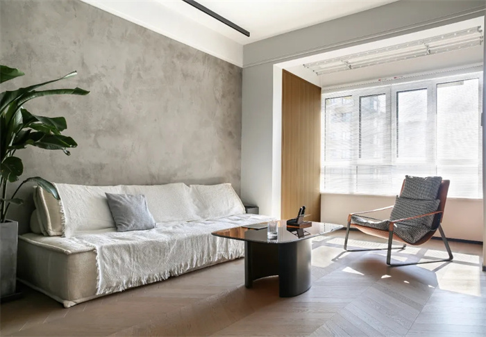 類似于侘寂風(fēng)的水泥風(fēng)格背景墻,斑駁的灰色紋路給人穩(wěn)定情緒的作用,背景墻采用的是仿真水泥墻面的墻布,比較實用且可以降低裝修成本,觸感柔軟。沙發(fā)上蓋了一條白色流蘇沙發(fā)布,以卡其色沙發(fā)套打底,整體顯得十分柔和。魚骨紋的拼接地板承襲了空間一貫的簡約風(fēng)格,偌大的立體綠植給增添一抹生機(jī)。