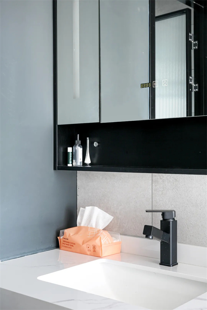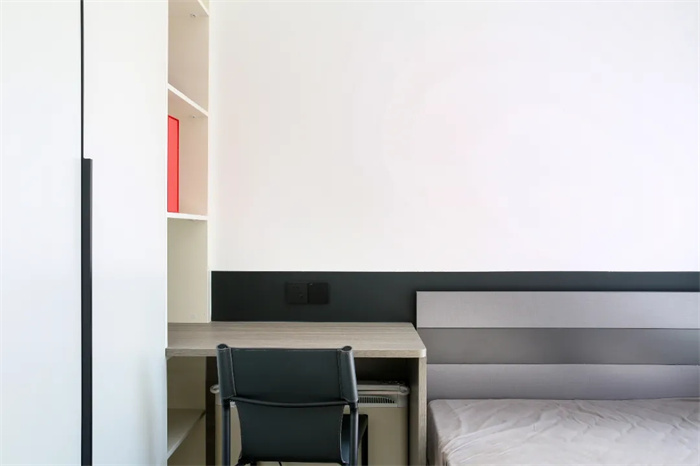 次臥同樣是采用整面到頂?shù)囊鹿?,搭配黑色的長條把手,靠墻的一側(cè)打造成開放收納格的設(shè)計,延伸的桌面下方放了暖風(fēng)機(jī)等設(shè)備,次臥格局雖不大,勝在簡約。