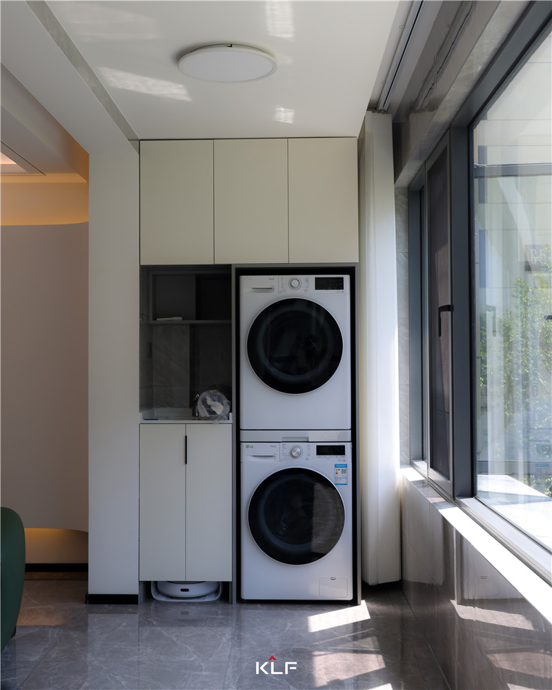 陽臺這有限的空間里,能夠有效地利用起來實屬不易。案例中我們將一側(cè)定制陽臺柜,不做晾曬功能的陽臺需要洗烘套裝,可以提前預(yù)留位置與電源。