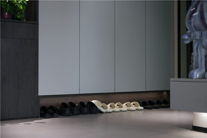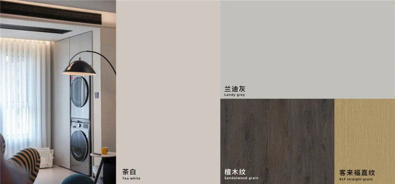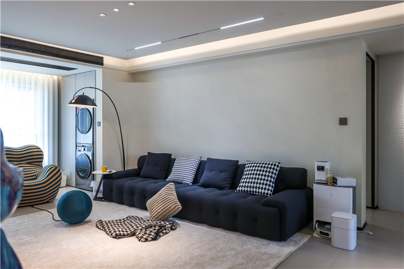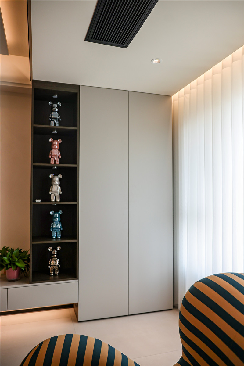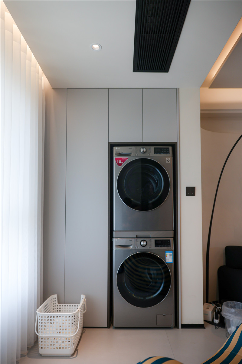 陽(yáng)臺(tái)一側(cè)選用展示格+到頂收納柜進(jìn)行儲(chǔ)物與展覽,另一側(cè)根據(jù)家電做洗衣柜,空間理想化利用,讓家有更多自由空間但依然有序。