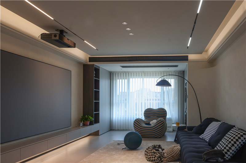 從玄關(guān)踏入后,極簡(jiǎn)風(fēng)的設(shè)計(jì)感便油然而生。通頂?shù)男癫捎妹饫衷O(shè)計(jì),檀木紋的造景臺(tái)下方做收納,上方采用格柵造型,簡(jiǎn)約中呈現(xiàn)敦厚質(zhì)感。柜體不落地設(shè)計(jì)加設(shè)燈帶輔助照明,更加實(shí)用。