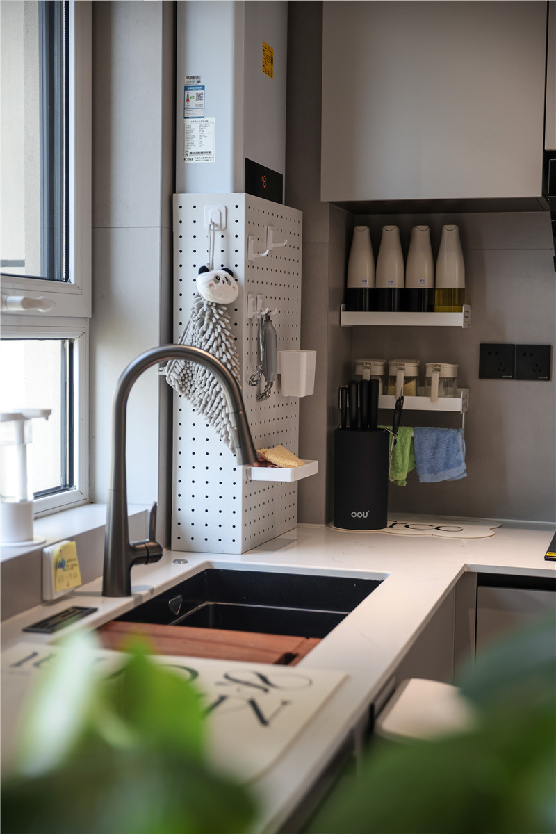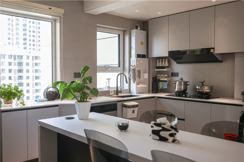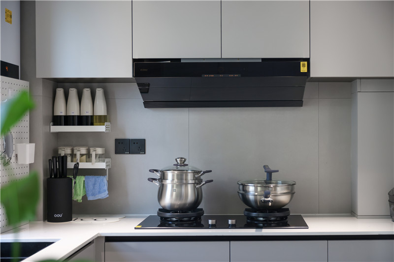 在廚房打造L型櫥柜,蘭迪灰的顏色飽和度低,搭配深色家電顏值更高。