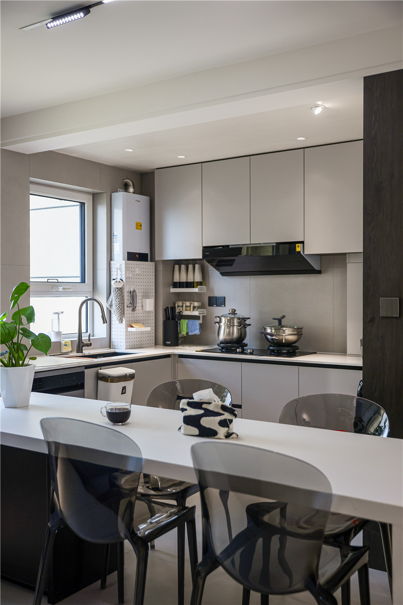 餐廳以白色系餐桌搭配透明餐椅,增添空間時(shí)尚感;靠墻一側(cè)做餐邊柜,檀木紋搭配水洗灰,撲面而來(lái)的意式極簡(jiǎn)風(fēng),內(nèi)嵌家電+免拉手設(shè)計(jì),給人不費(fèi)勁的精致感。