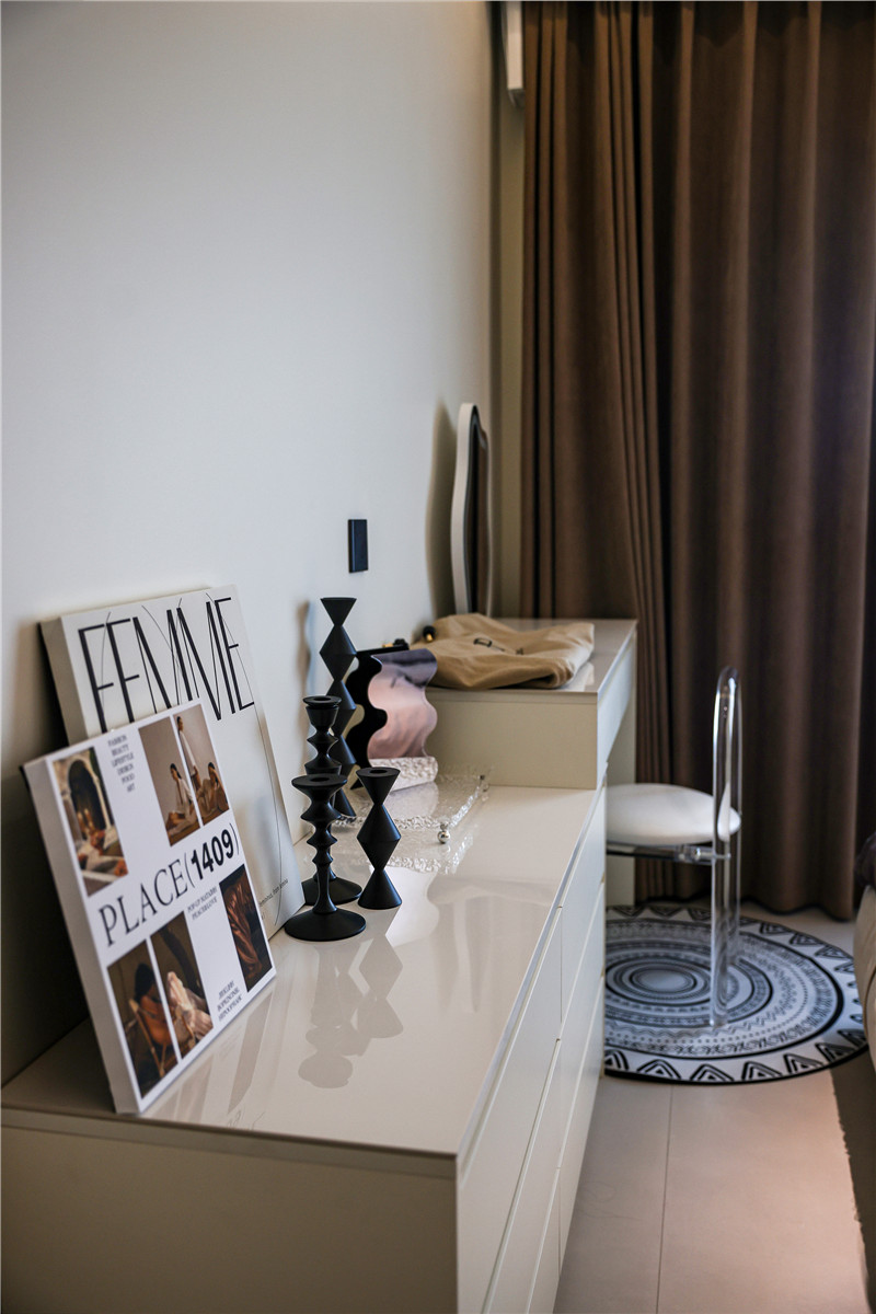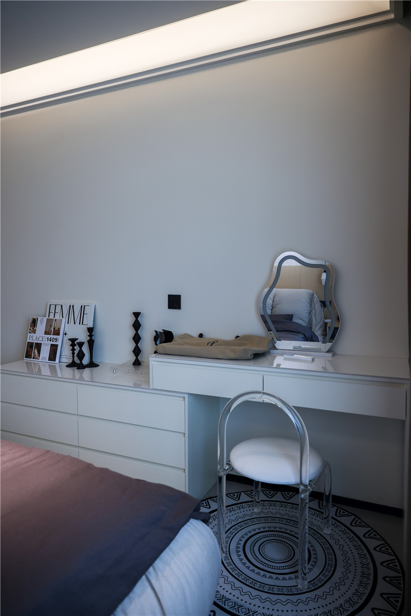 因?yàn)榧依餂](méi)有做衣帽間,所以在主臥中,客來(lái)福打造了一面到頂高柜進(jìn)行衣物儲(chǔ)納,茶白的色調(diào)清冷高級(jí),同樣也運(yùn)用在床尾的斗柜上,抽屜造型更便于拿取物品。與斗柜相連,同色系同材質(zhì)的梳妝臺(tái)也滿足了居者的生活需求。
