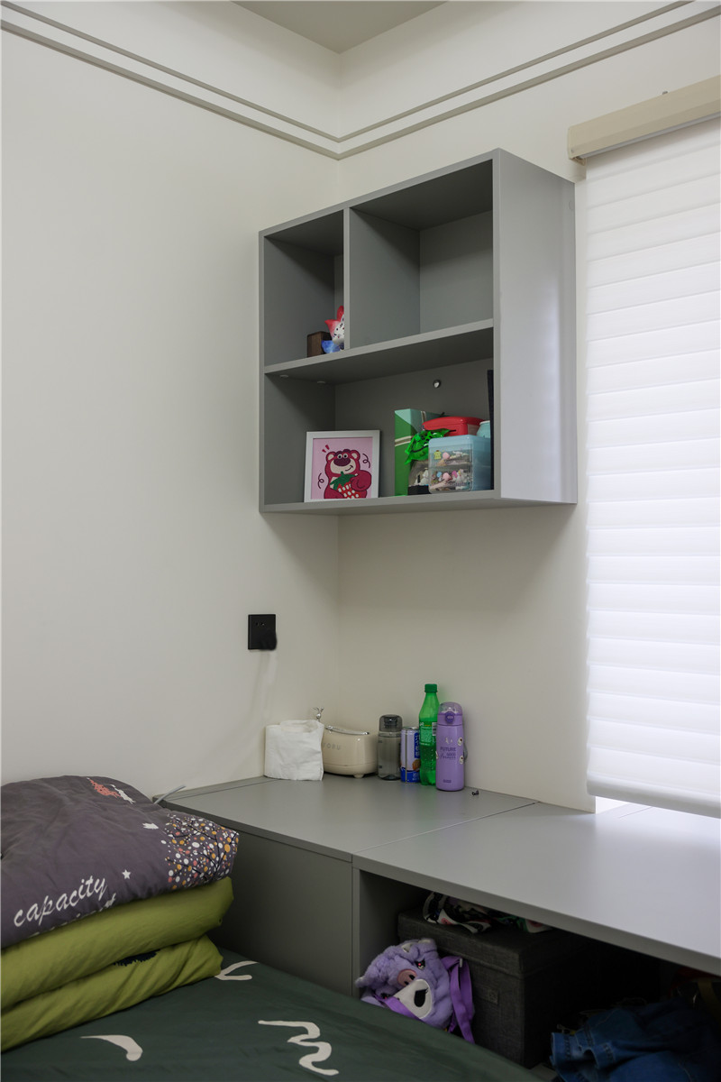 次臥空間與兒童房都在睡眠區(qū)+收納區(qū)的基礎(chǔ)上各自增設(shè)人性化定制的家居產(chǎn)品,例如兒童房中在床尾設(shè)計(jì)的長(zhǎng)書(shū)桌以及壁掛式收納格,讓整個(gè)房間功能更為豐富。