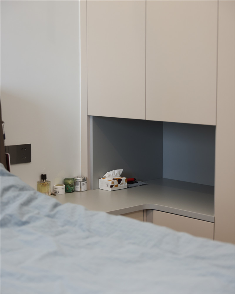 主臥采用無主燈設(shè)計(jì),內(nèi)嵌燈光與射燈營(yíng)造空間氛圍感;靠窗邊做了一個(gè)嵌入柜,不占地方還分散了室內(nèi)的存儲(chǔ)壓力。