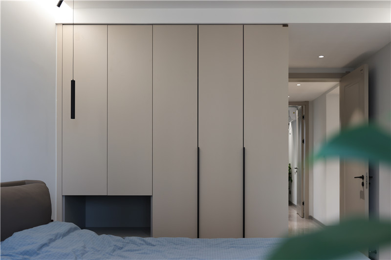次臥做了一組到頂衣柜,茶白色門板好看好搭;為了節(jié)省空間,設(shè)計(jì)師從柜體中延伸做床頭柜,頗具特色;整體布局簡(jiǎn)約大氣,協(xié)調(diào)整體氛圍。