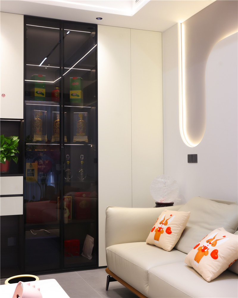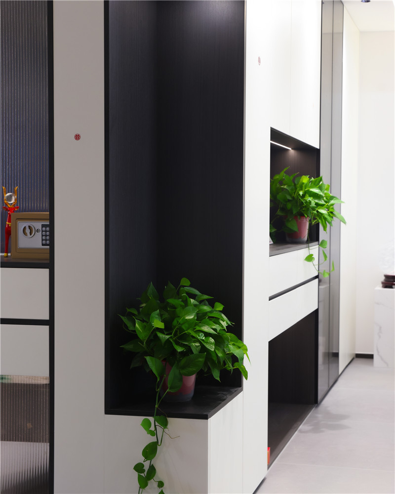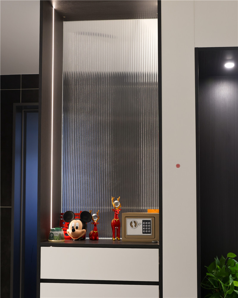 此玄關(guān)柜也充當(dāng)隔斷的作用,整面白玻配合型材拐彎,若隱若現(xiàn)感讓人眼前一亮。