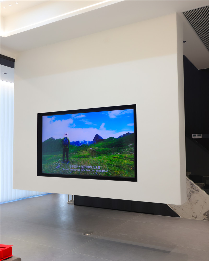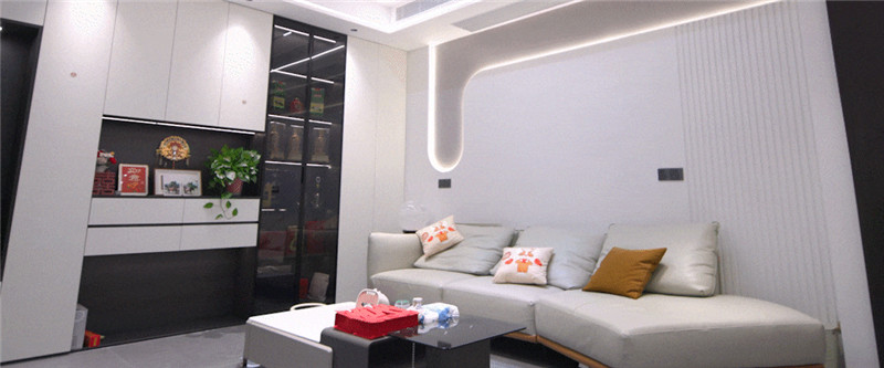 電視背景墻整體挑高處理,內(nèi)嵌電視機(jī),“躺平”式觀劇一整個(gè)爽住,還方便衛(wèi)生清理;沙發(fā)背景墻做圓弧造型頗富藝術(shù)感,配以燈光的運(yùn)用,氛圍感躍于空間。