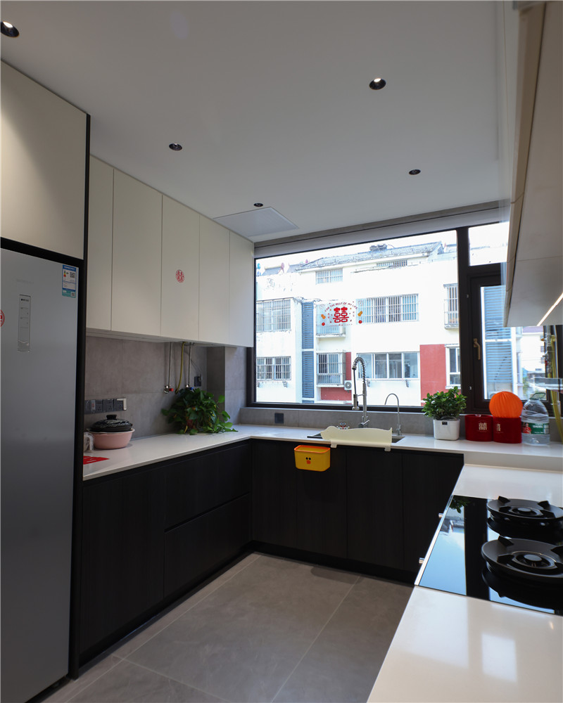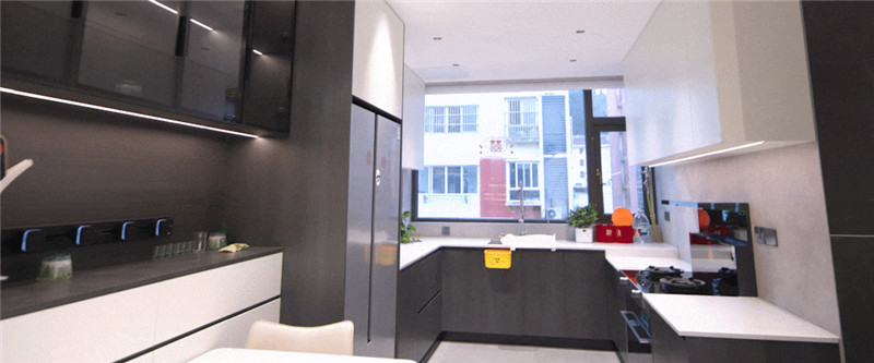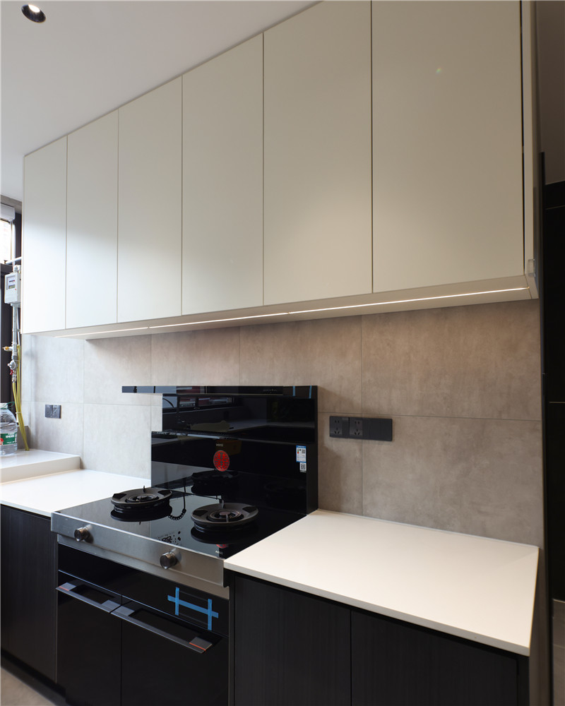 廚房U字型布局,遵循洗→切→烹→盛的動(dòng)線,便捷且收納力強(qiáng);櫥柜箱體及吊柜采用無(wú)拉手設(shè)計(jì),視覺(jué)清新;整體臺(tái)面巖板運(yùn)用,耐磨防滲水;冰箱與柜體組合,協(xié)調(diào)整體空間布局。