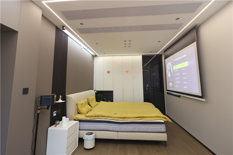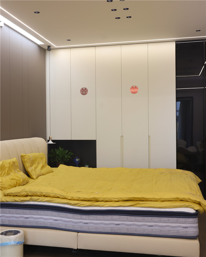 臥室一側(cè)整面立柜,配合銑槽拉手簡(jiǎn)約利落;梳妝臺(tái)抬高設(shè)計(jì),融入圓弧造型,典雅溫柔;整體空間主燈與輔燈相結(jié)合式設(shè)計(jì),空間層次感強(qiáng)。