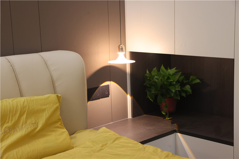 床頭背景墻加入格柵設(shè)計(jì),增強(qiáng)設(shè)計(jì)感;床頭柜弧形收邊,配合以小吊燈,氛圍感滿滿。