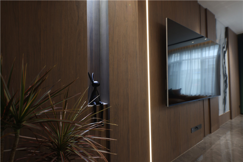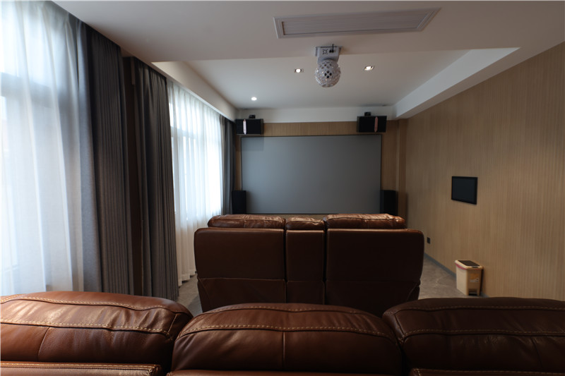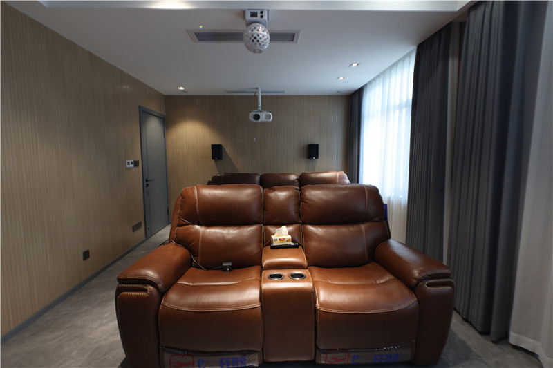 墻體整面背景墻,以木材的溫潤感成就舒適空間;以投影代替電視機,布局合理;這樣的空間還能作為多功能房使用,分散壓力。