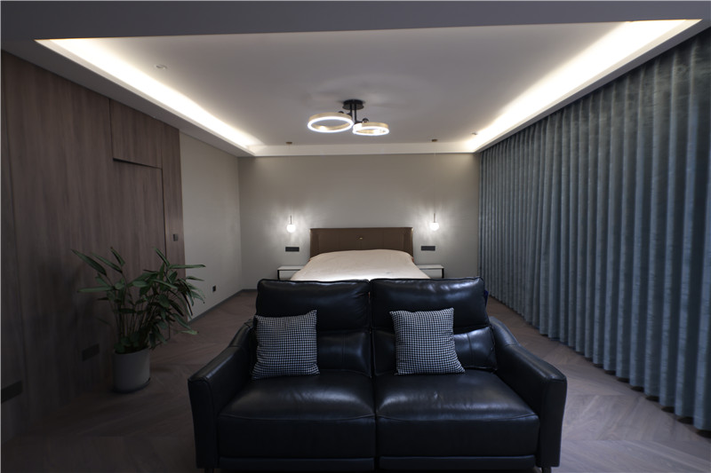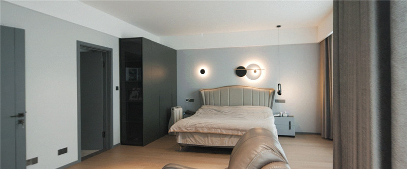 主人房:遵循主人喜愛的對稱設計,包含床頭柜、床頭燈、沙發(fā)等,干凈利落;整體色調不搶眼卻彰顯韻味;隱形推拉門的運用,視覺平和。