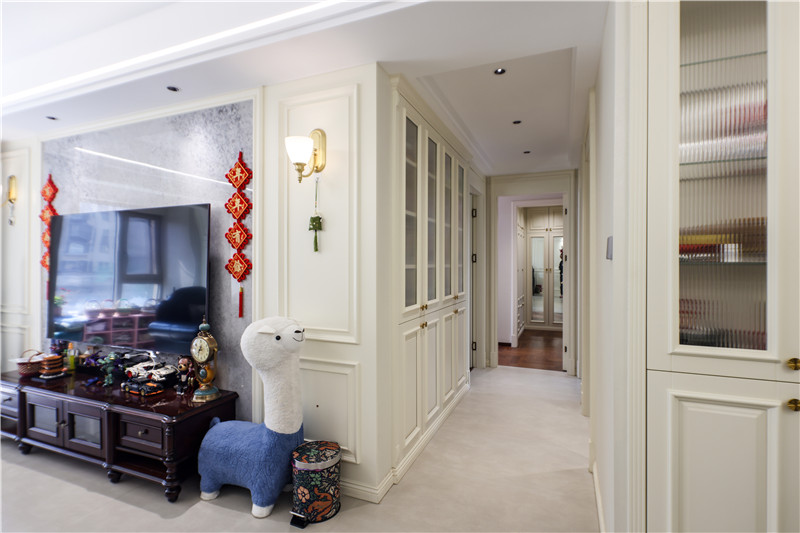 入戶玄關(guān)柜為整面到頂構(gòu)造,協(xié)調(diào)整體家居動(dòng)線、自然美觀;暖色系燈光、凹凸有致的玻璃等元素加入,營(yíng)造出溫馨氛圍。