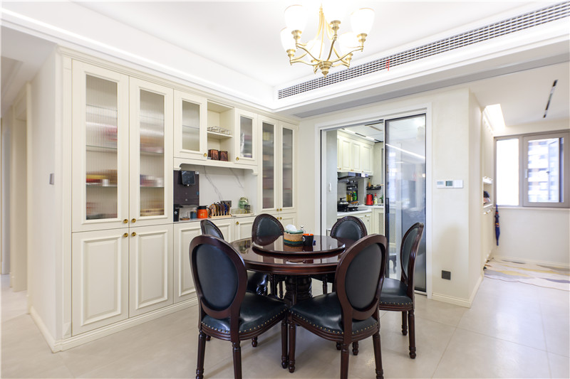 餐廚空間以推拉門做區(qū)隔,減輕油煙困擾;圓弧形配套餐桌,柔和之美下是高安全系數(shù);一字型餐邊柜,中部掏空預(yù)留來(lái)放水杯、飲水器等,存儲(chǔ)能力強(qiáng)。