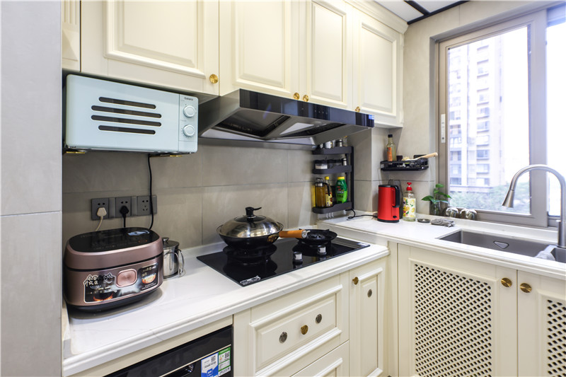 櫥柜整體U型構(gòu)造,遵循洗→切→烹→盛的動(dòng)線,使得空間小而不局促;櫥柜加入鏤空設(shè)計(jì),空氣流通;將烤箱等大電器嵌入櫥柜中,視覺(jué)統(tǒng)一清新。