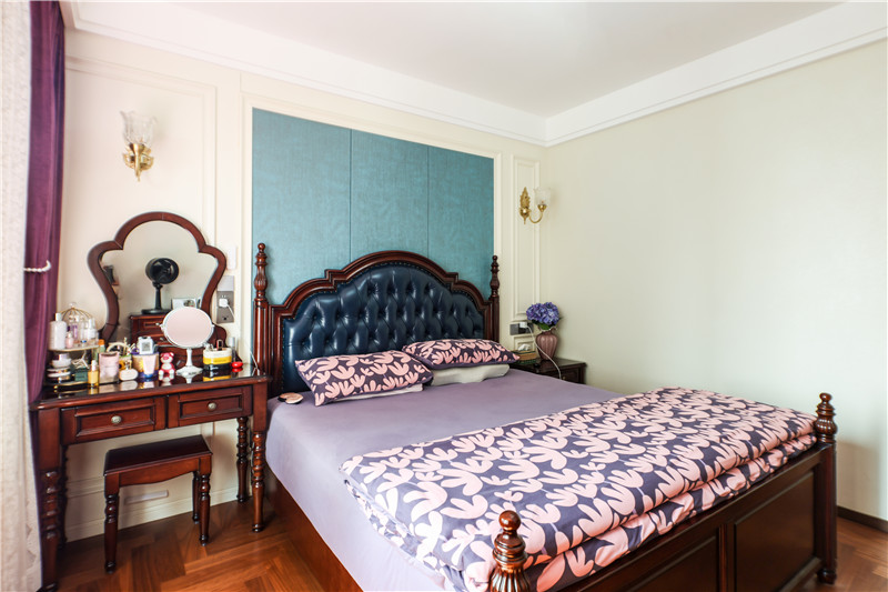 主臥:復(fù)古美式的雅致,是主臥空間傳達(dá)給人的韻味。床頭背景墻采用藍(lán)調(diào),形成拼色;床頭兩側(cè)古典樣式小吊燈,時(shí)尚奢華;一側(cè)床頭柜升級(jí)為梳妝臺(tái),高級(jí)精致。