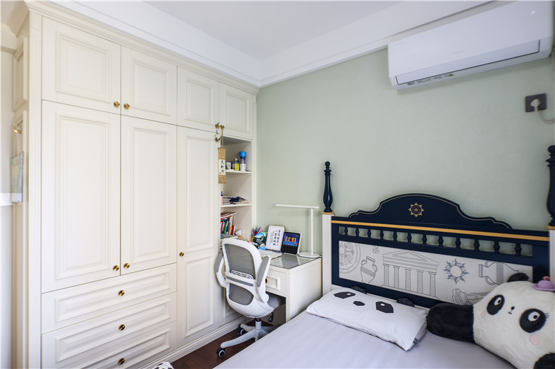 兒童房:床頭板樣式,讓人眼前一亮;衣柜延伸做書(shū)桌,協(xié)調(diào)自然;柜體設(shè)置為長(zhǎng)衣、短衣及疊衣區(qū),明晰實(shí)用;整體兒童房色彩較豐富,守護(hù)孩子的童真童趣。