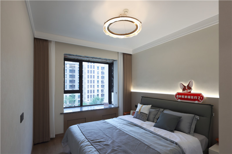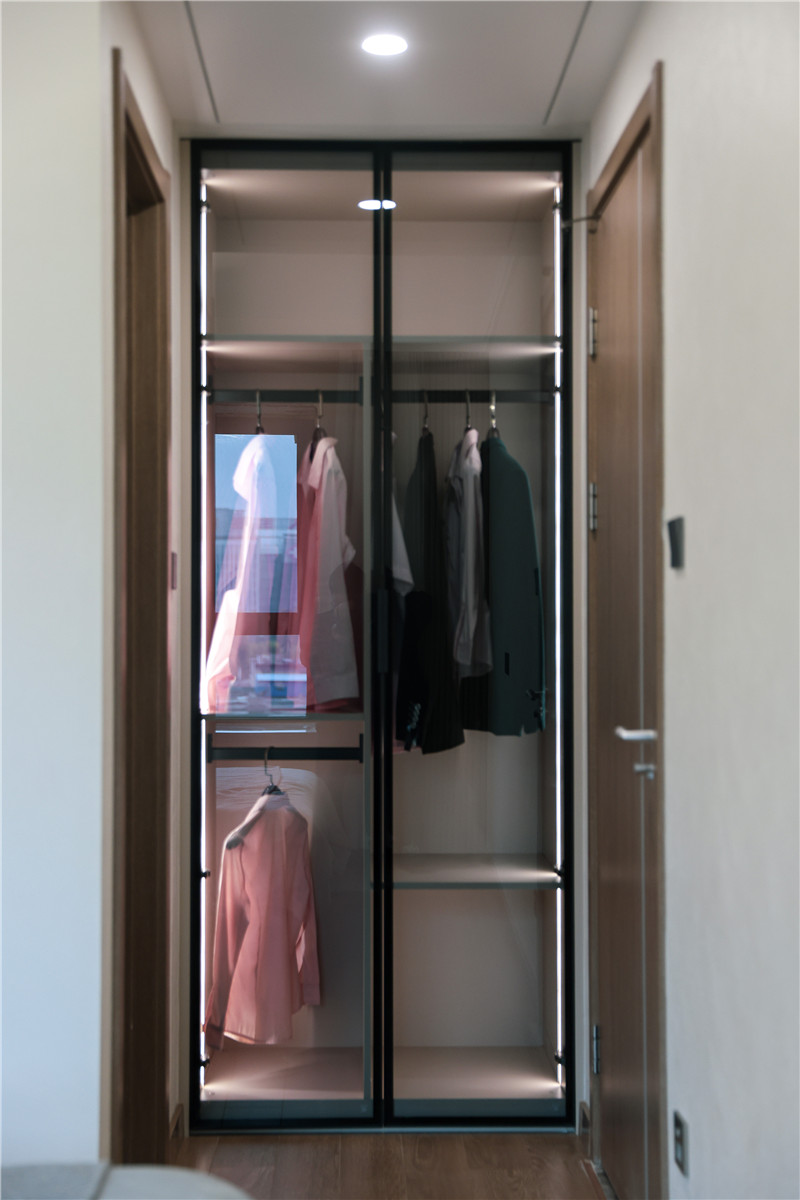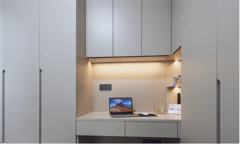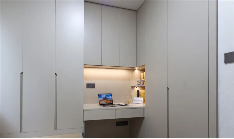 臥室衣柜風(fēng)格和諧統(tǒng)一,L型衣柜合理利用臥室空間并將收納功能擴(kuò)大到理想狀態(tài);拐角處設(shè)計(jì)辦公學(xué)習(xí)區(qū),實(shí)用不突兀,整個(gè)空間以簡潔舒適為主。