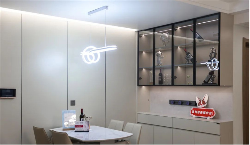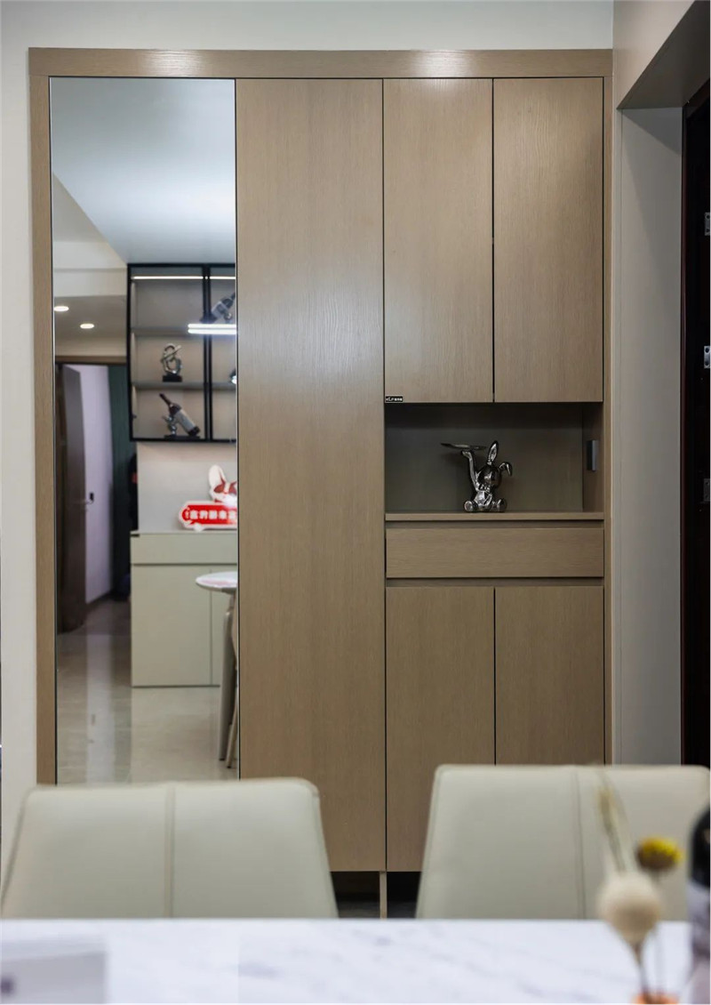 餐邊柜與護(hù)墻板色調(diào)統(tǒng)一,顯得空間和諧寬敞;玻璃吊柜內(nèi)置燈帶,既起到調(diào)節(jié)大面積茶白色帶來的素凈氛圍,又很好呈現(xiàn)輕奢風(fēng)強(qiáng)調(diào)的精致細(xì)節(jié);免拉手設(shè)計(jì)簡約實(shí)用,也減少日常磕碰。