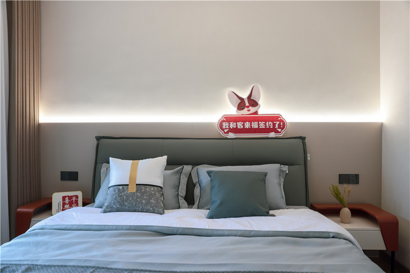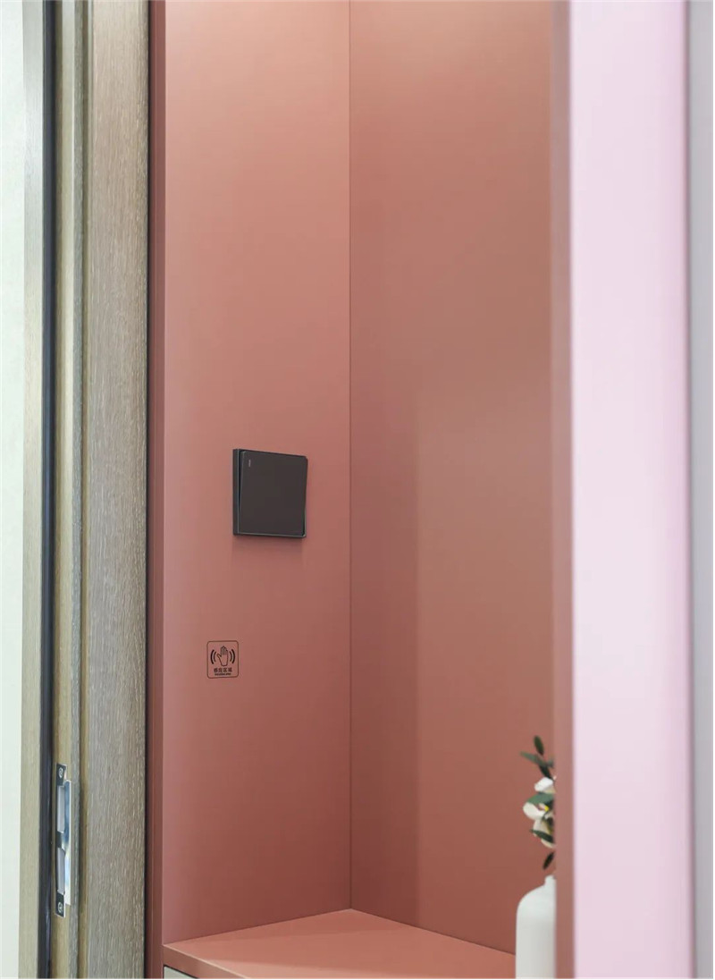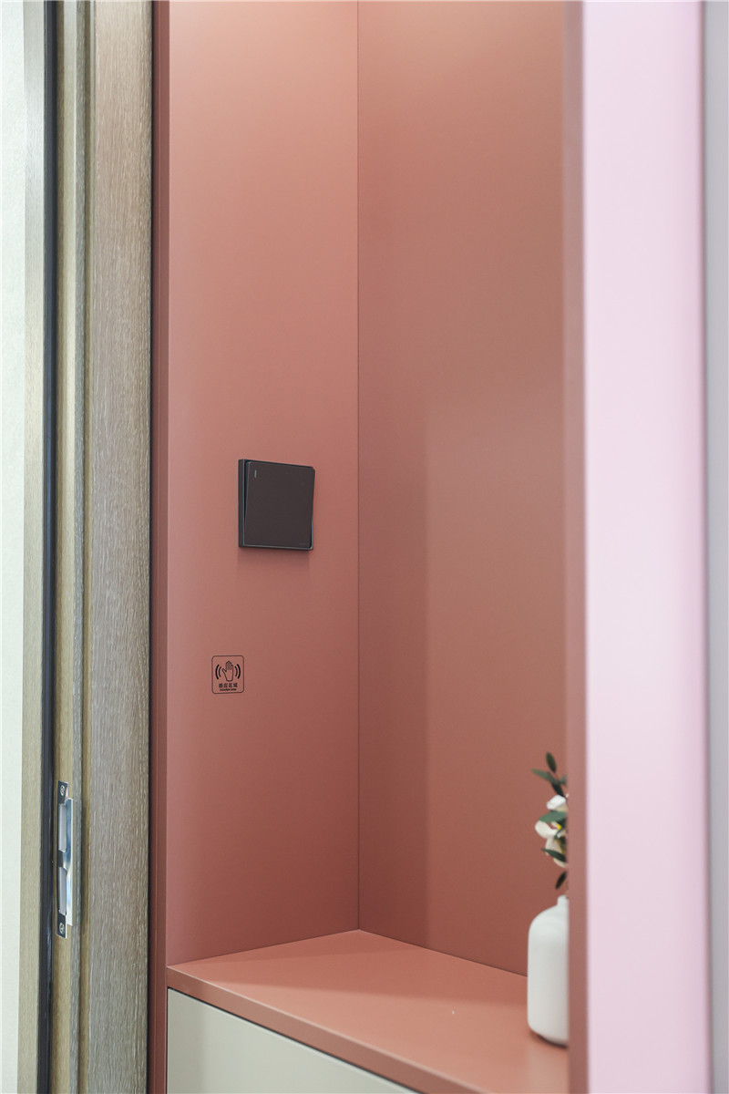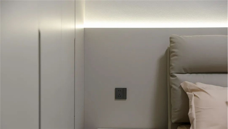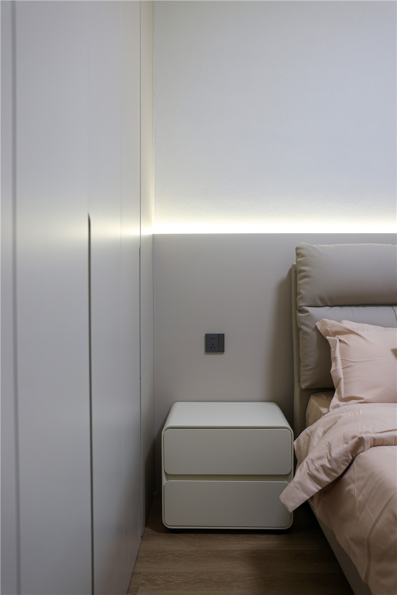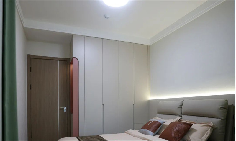 以實(shí)用為主要需求的臥室設(shè)計(jì):簡約的配色與簡單的衣柜設(shè)計(jì),一柜到頂式增加儲(chǔ)物能力、半銑j型拉手簡潔實(shí)用,其中跳色粉套格設(shè)計(jì)既時(shí)尚又具有一番創(chuàng)意,為舒適的空間帶去一絲趣味。