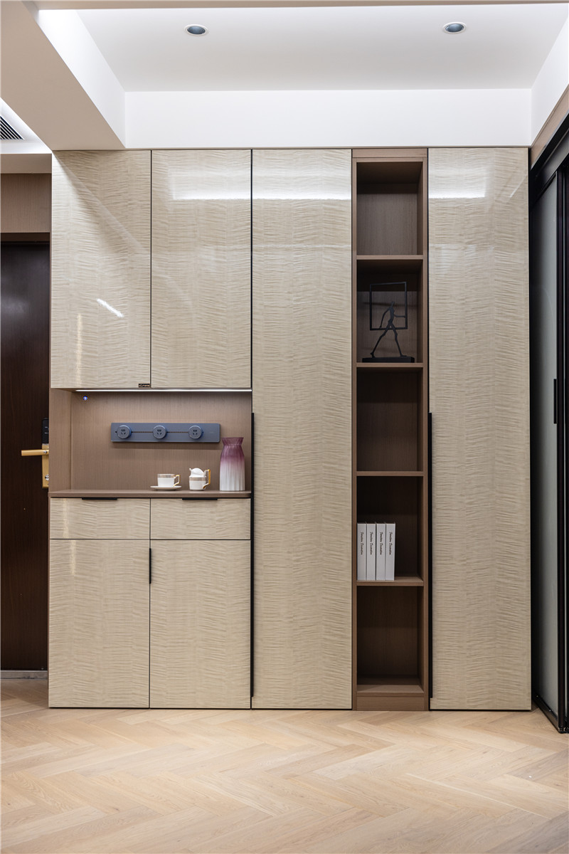 玄關(guān)柜為整面立柜,長拉手、短拉手、無拉手配合,簡約利落、清新雅致。