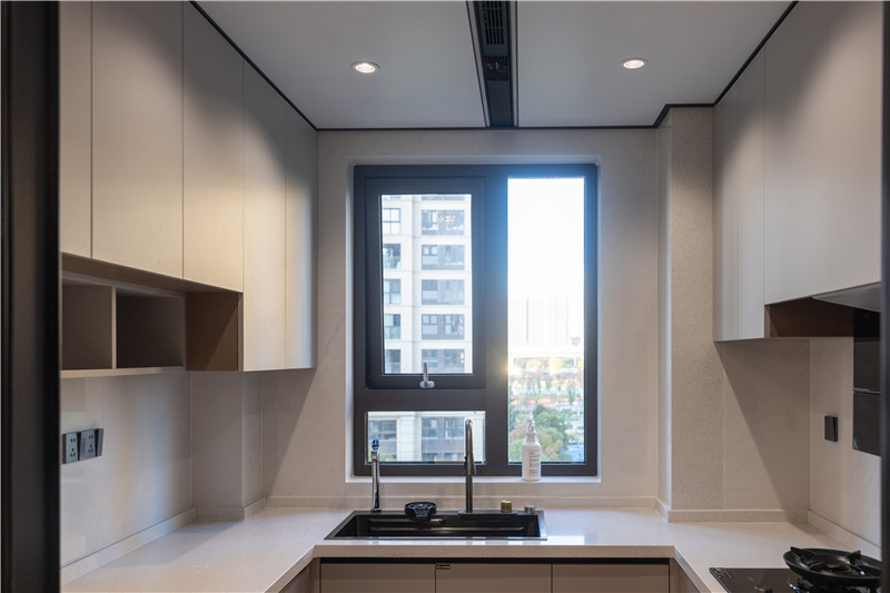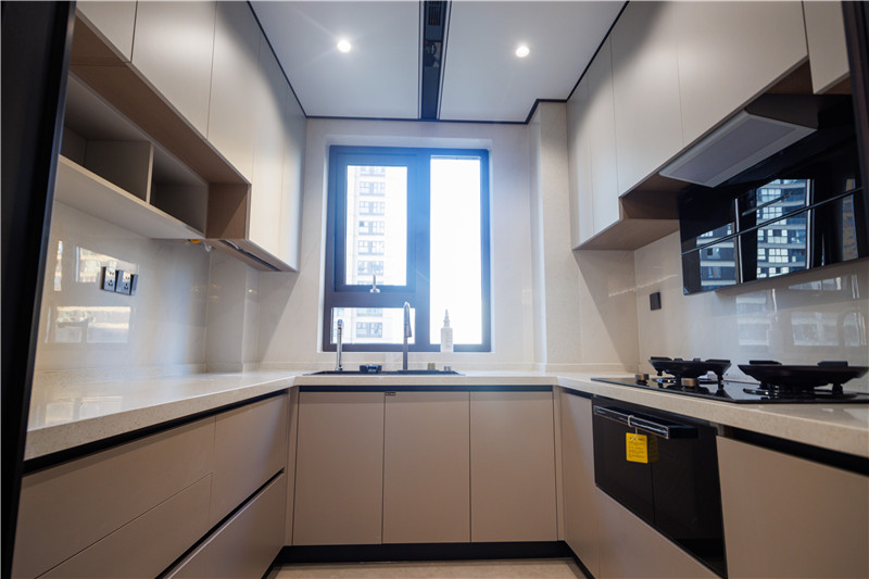 廚房空間遵循洗、切、烹、盛動線,減輕隱形家務(wù),其整體巖板臺面耐刮防滲水,實(shí)用性強(qiáng)。