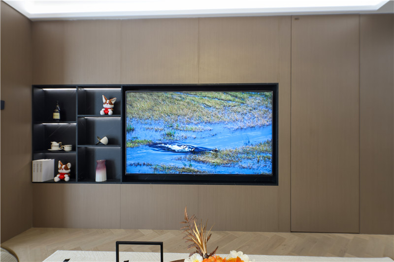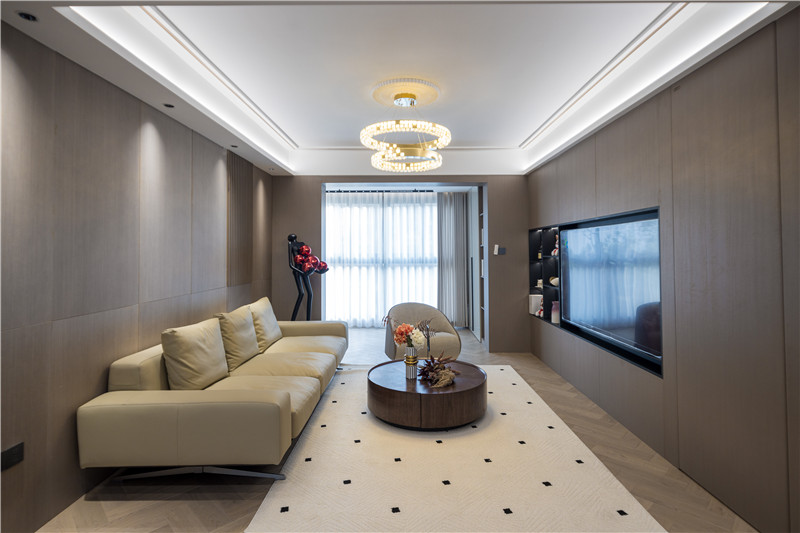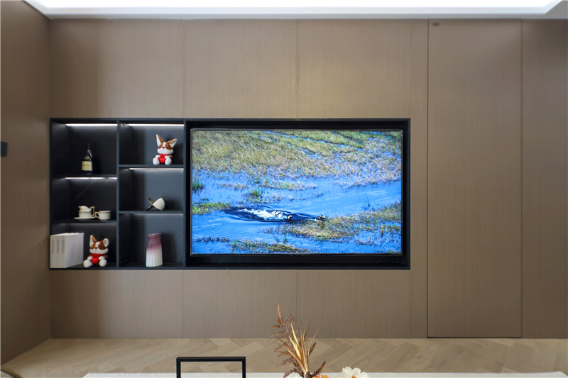 電視背景墻為科技直紋,電視機(jī)、裝飾柜深調(diào)嵌入,以視覺差突出美感;沙發(fā)背景墻科技直紋+水漆科技銀梨+柵格設(shè)計+射燈,拼接式彰顯智慧;硬裝與軟裝相輔相成,雅致大氣。
