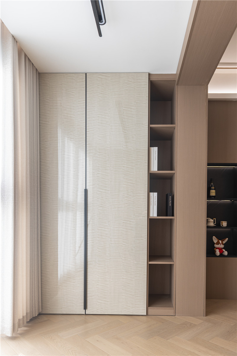 衣柜延伸以主臥的構(gòu)造,差異于延伸床頭柜,柜體科技直紋與水泥灰門板形成跳色,一體化設(shè)計和諧統(tǒng)一。