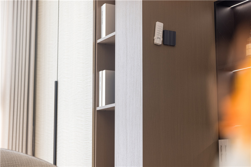 門板為楓影超晶板,亮光屬性與光影配合,為空間增色;中部預(yù)留掏空、整面窄立隔板為開放式構(gòu)造,是小物件、裝飾物的存放地。