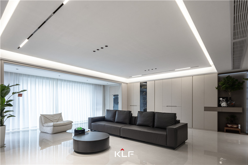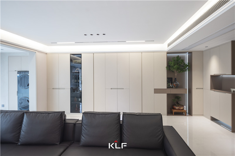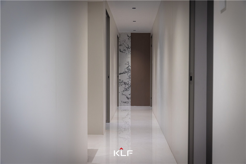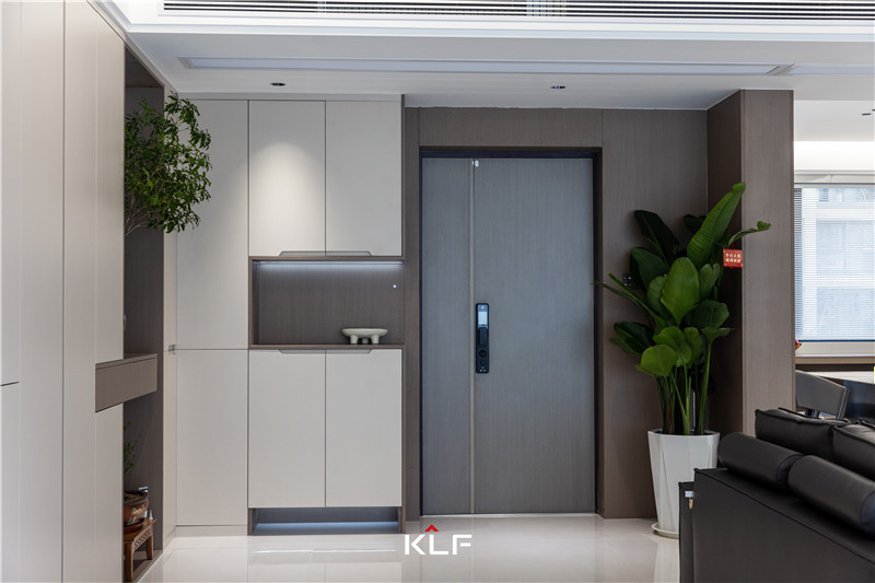 玄關(guān)中部及底部掏空,以人體工程學(xué)設(shè)計保障出入便捷度。茶白與檀木紋色彩拼接,射燈與輔助燈點綴局部,一整個實用住了。