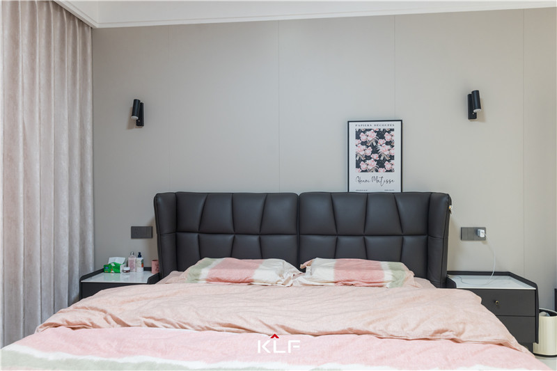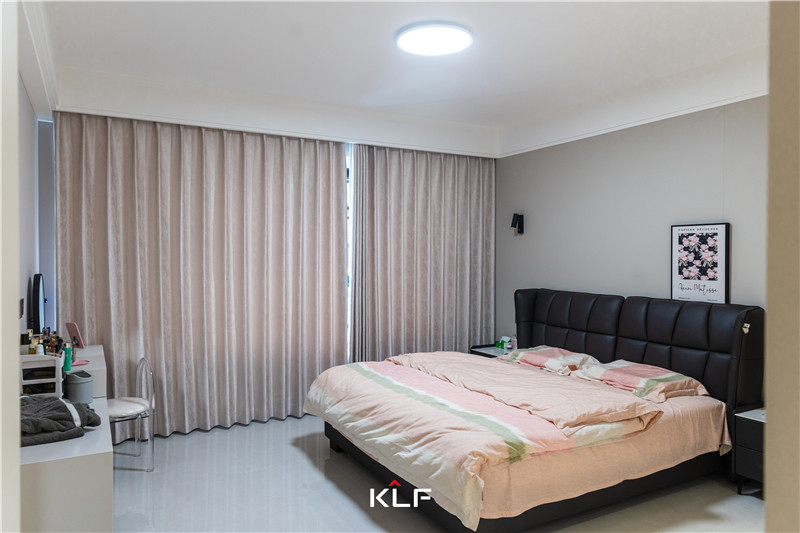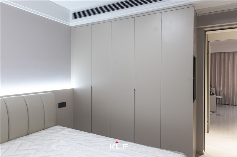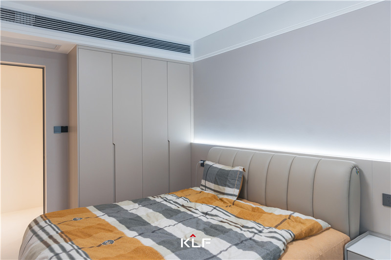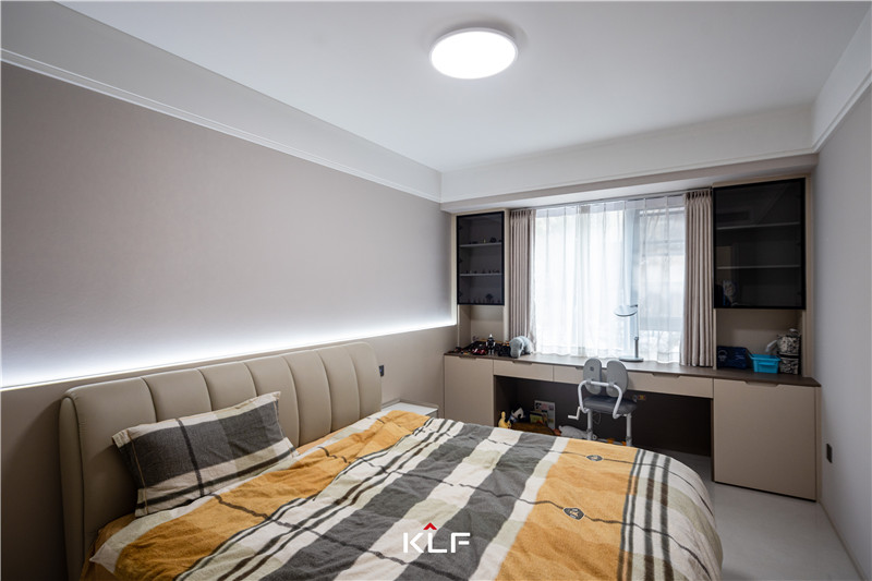 主臥以茶白調(diào)盡顯柔和溫潤。入門到頂式立柜協(xié)調(diào)拼接式床頭板、銑槽長拉手不占空間,靠窗建立小型書柜,靈活性強。