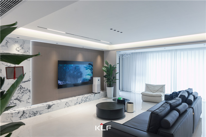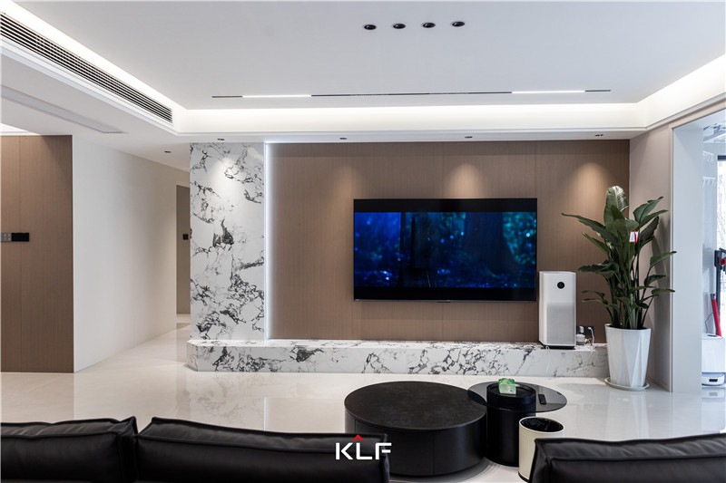 木質(zhì)電視背景墻邊圍以大理石紋磚做突出,沙發(fā)背景墻整面立柜設(shè)計,玻璃柜、木質(zhì)柜做拼接,以穿插設(shè)計、拉手造型做個性化,彰顯美感。