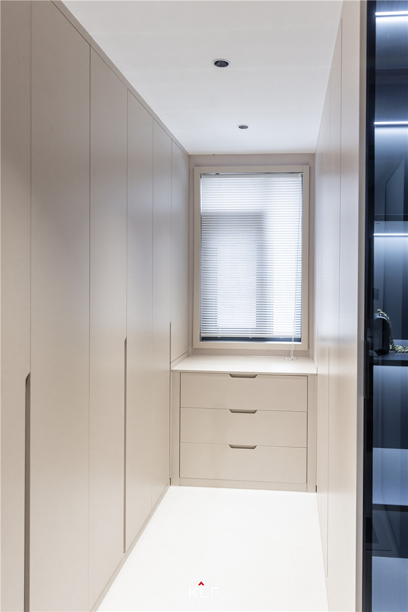 家里的狹長區(qū)域不知道怎么利用?不妨做成獨立式小型衣帽間。衣柜呈U型構(gòu)造,抽屜與立柜相組合,是家里的多功能房,分散存儲收納壓力。