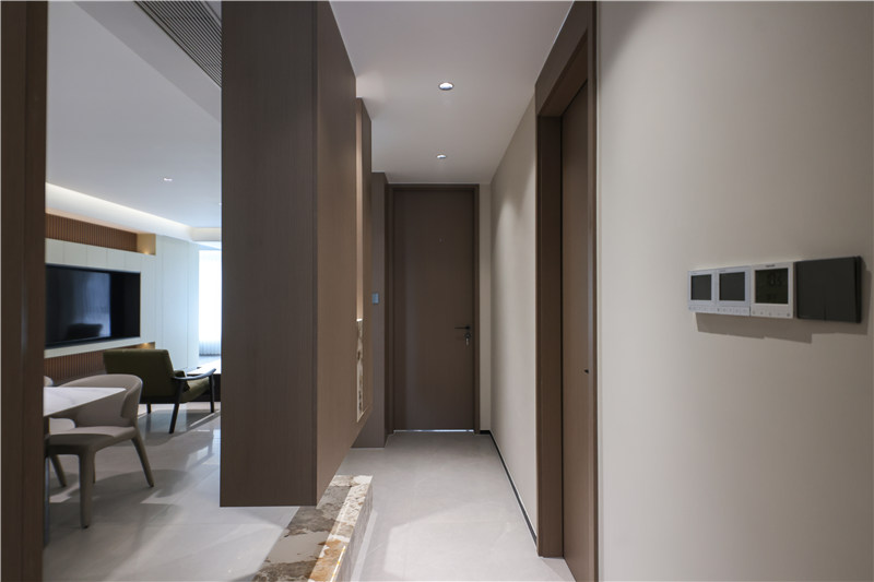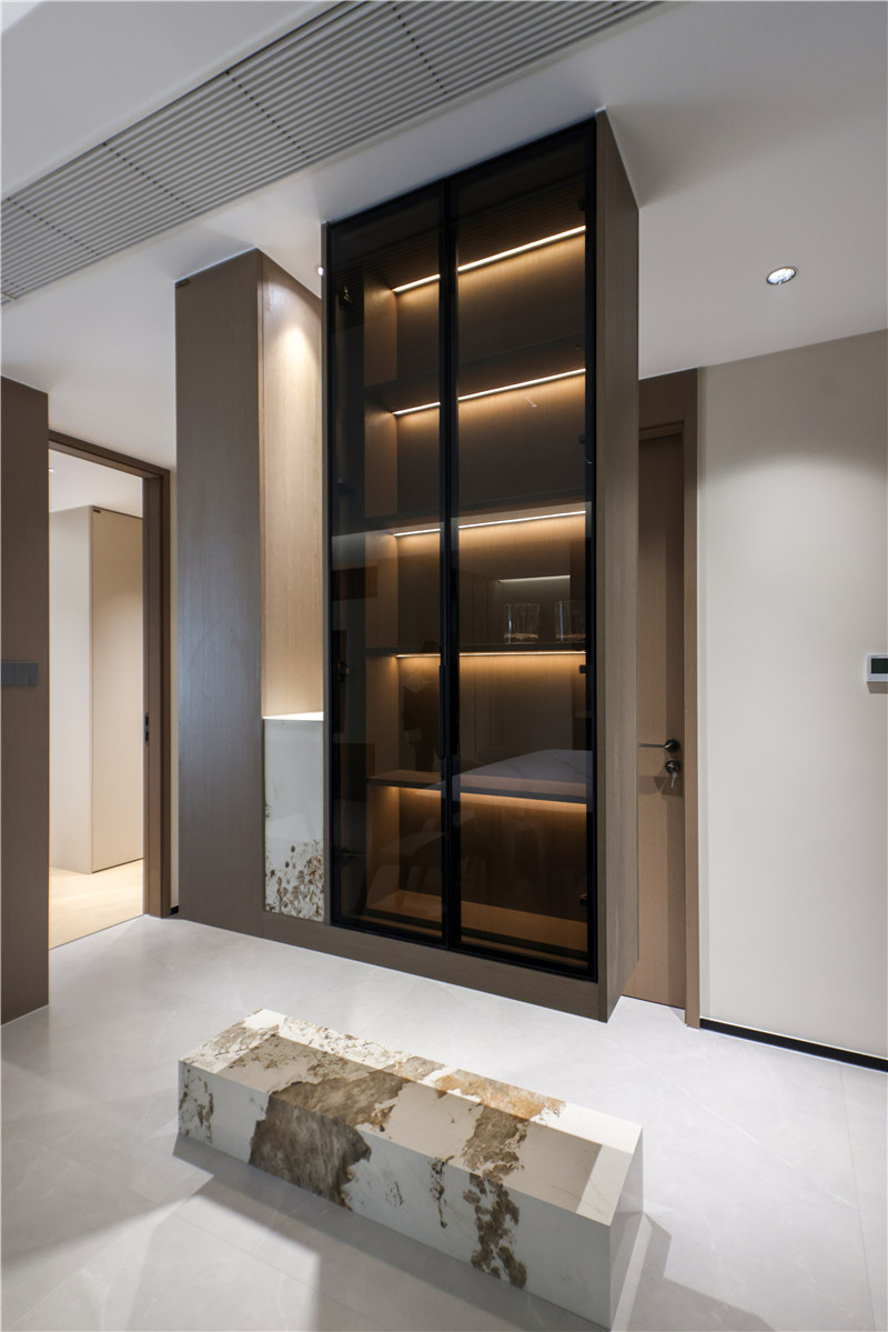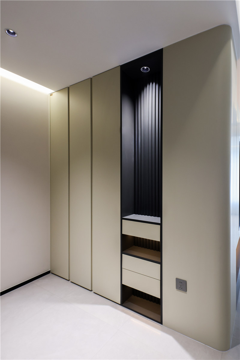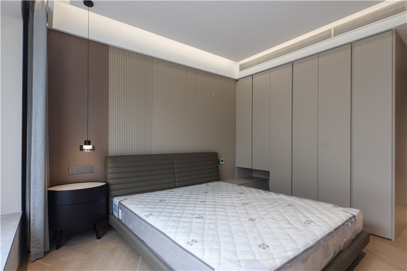 主臥進(jìn)門一字型無(wú)拉手到頂柜延伸以床頭柜,區(qū)別于對(duì)側(cè)柱形柜,茶白色柔和雅致。