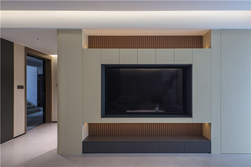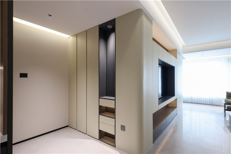 進(jìn)門玄關(guān)柜與電視柜組合,連接處以圓弧收邊,杏仁黃色調(diào)通鋪展現(xiàn)高級(jí)柔和氣質(zhì)。玄關(guān)側(cè)邊高柜便捷掛衣,中側(cè)穿插抽屜、背板跳色配合以柵格造型,彰顯個(gè)性化美感。