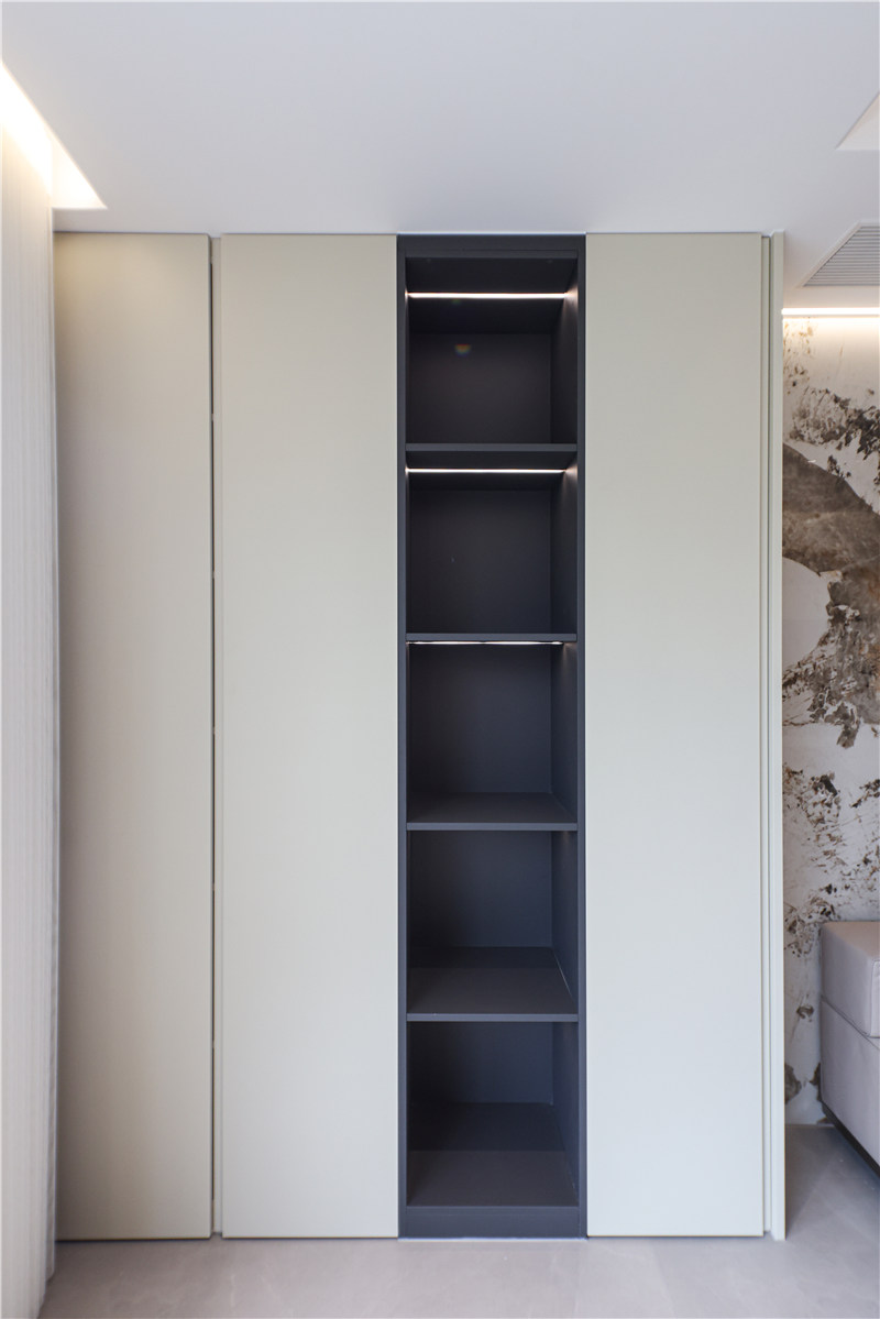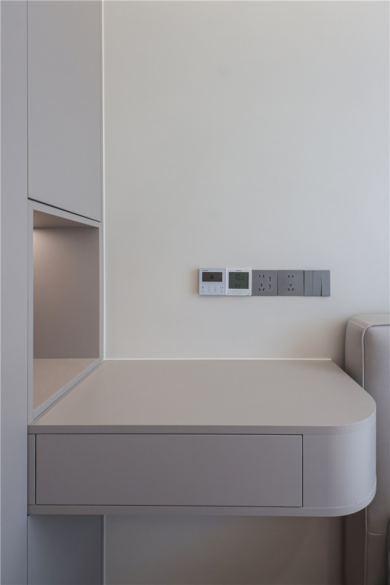 女孩房整體無(wú)主燈設(shè)計(jì),打造出溫馨柔和的氛圍感;衣柜呼應(yīng)于男孩房設(shè)計(jì),蘭迪米灰色低調(diào)且不失質(zhì)感,床頭柜上下方預(yù)留插座,方便實(shí)用。